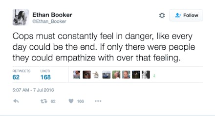 "Cops must constantly feel in danger, like every day could be the end," Twitter user @Ethan_Booker wrote, pointedly, Thursday morning. "If only there were people they could sympathize with over that feeling."