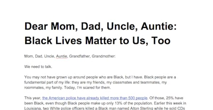 For all of these reasons, I support the Black Lives Matter movement. Part of that support means speaking up when I see people in my community — or even my own family — say or do things that diminish the humanity of Black Americans in this country. I am telling you this out of love, because I don't want this issue to divide us. I'm asking that you try to empathize with the anger and grief of the fathers, mothers and children who have lost their loved ones to police violence. To empathize with my anger and grief, and support me if I choose to be vocal, to protest. To share this letter with your friends, and encourage them to be empathetic, too.