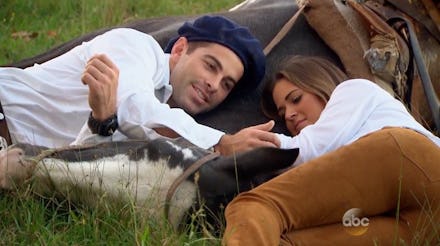 JoJo and Alex ride around awkwardly on a horse before arriving in a pasture, where they watch a horse-professional seductively embrace a horse until it is fully laying down on the grass, at which point JoJo and Alex go over and lay on top of it like it's a beanbag chair. It would not be an exaggeration to say that this is in the top five weirdest things that have ever happened on a Bachelorette one-on-one.