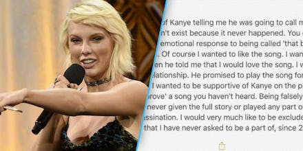 Taylor clapped back that same night, Instagramming what appears to be a iPhone Notes screenshot that attempts to debunk Kim's Snapchat, and claiming that the video doesn't show her consenting to being called "that bitch" in "Famous."