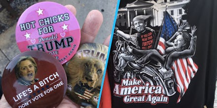 Although vendors selling swag that berates Clinton is nothing new for a convention (Think Barack Obama punching bags at the 2012 RNC), this year's fare has a distinctly different tone that not only focuses on not voting for Clinton — because, presumably to some vendors, she's "a bitch" — but specifically addresses and celebrates the Republican Party's attractive female members.