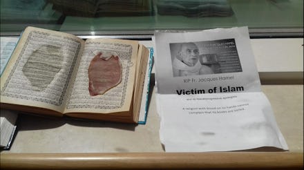 Lying next to the bacon-covered Quran was a printout featuring the name and face of Fr. Jacques Hamel, who was killed earlier this week in Normandy, France. The Islamic State claimed responsibility for his death.