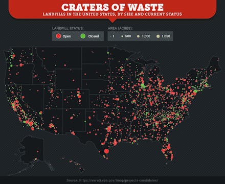 The company SaveOnEnergy compiled data from the Environmental Protection Agency and created a map that illustrates the massive number of landfills across the U.S. Red dots represent open landfills; green dots represent closed ones. The bigger the dot, the bigger the landfill.