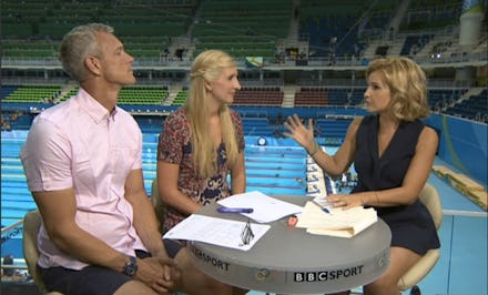 The Olympics are a BFD, aquatic sports like swimming being among the best loved of all the events. But apparently, popular appreciation of pool races was not enough to anchor the internet's attention. During a BBC broadcast, live from the Rio Aquatics Center, host Helen Skelton wore a short dress appropriate to the humid climate, and viewers had eyes only for her legs.
