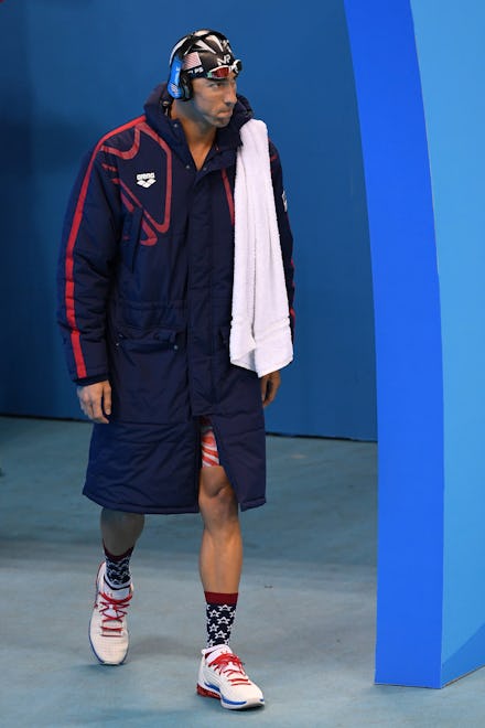 The legendary U.S. swimmer was caught looking, er, a little unenthused before hitting the pool for the 200-meter butterfly semifinal on Monday, CNN reported. His hood pulled up, Phelps appeared to be angrily brooding as his competitor, South African swimmer Chad le Clos, shadow boxed in front of him.