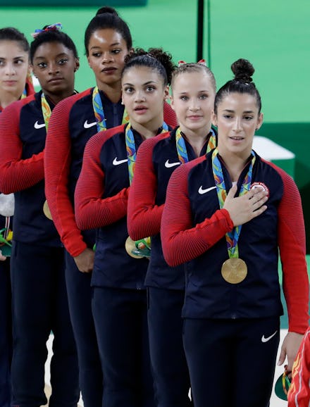 At Tuesday night's medal ceremony for the United States gymnastics team, all of the members of the so-called "Final Five" dutifully placed their hands over their hearts as the National Anthem blared from the auditorium speakers, honoring their golden victory for the women's team all-around.