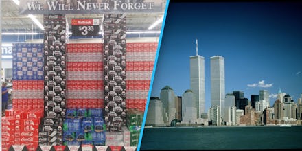 As the picture depicts, black boxes of Coke Zero have been arranged in two tall stacks, made to resemble the fallen twin towers. Red, grey and blue boxes of other Coke products are organized as an American flag-like backdrop for the towers. A banner that reads "we will never forget" hangs above the display, and features both Wal-Mart and Coke's logo.