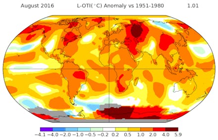 In addition to being tied for the hottest month on record, August was 1.76 degrees Fahrenheit warmer than the month's average temperature between 1951 and 1980, GISS' base period to which subsequent data is compared.