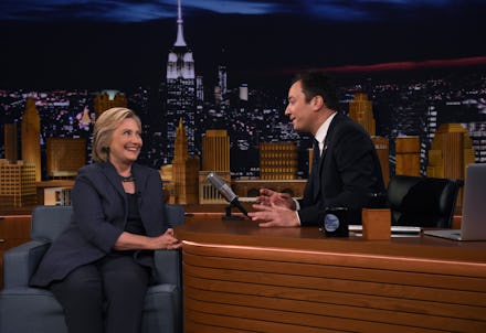 During Clinton's appearance, Fallon took a few shots at the Democratic nominee, poking fun at her pneumonia diagnosis by wearing a surgical mask and using hand sanitizer after the two high fived.