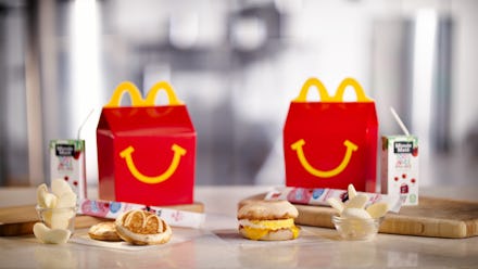 Kids can choose from either two McGriddles or an egg and cheese McMuffin that's served without Canadian bacon. They also get to choose two sides — apple slices, yogurt or kids' fries, at lunch or dinnertime. Like the rest of the McDonalds breakfast menu, breakfast Happy Meals will be available all day.