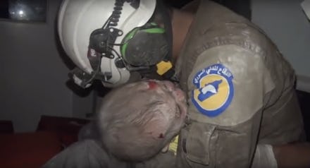 After pulling a days-old baby from the ruins of an airstrike in Idlib, a Syrian Civil Defense volunteer quietly sobs as he holds the dust-and-blood-covered infant to his chest.