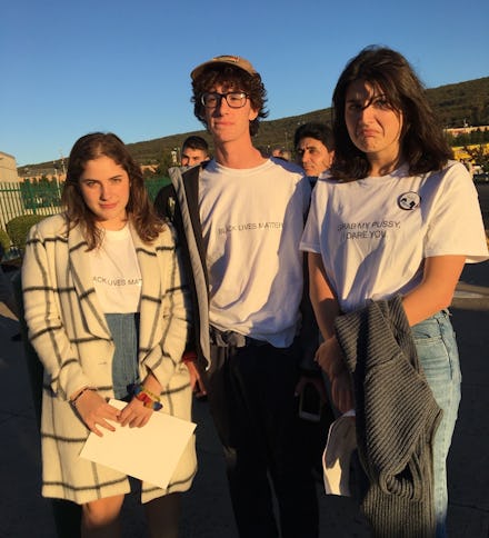 Frace and May's T-shirts inscribed with the words "Black Lives Matter" surely turned heads (Trump, after all, still believes the Central Park Five are guilty), but it was Lehane's shirt with the words "grab my pussy, I dare you" that generated the loudest uproar from attendees.