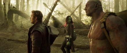 The first look, which director James Gunn uploaded to his YouTube account, features peeks at the main cast of the first film. There's Peter Quill, aka Star-Lord (Chris Pratt), feeling some type of way about Gamora (Zoe Saldana). Then there's Drax (Dave Bautista) discouraging Quill from falling for her. And at the very end there's Mini-Groot poking its head out of Rocket (Bradley Cooper) the raccoon's fur.
