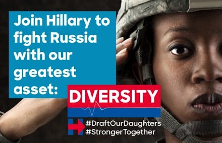 A new hashtag campaign called #DraftOurDaughters — consisting of fake ads, catchy slogans and hashtags with an obsessively anti-Russia bend — is catching fire on Twitter and Reddit, aimed at convincing people that Clinton has just made the drafting of American women into the military a key part of her platform.