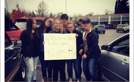 In a tweet from an account that has since been deleted, the Oregonian reported, a former student posted a picture with a group of friends, which included current students, holding a sign that said "Welcome back to the farm, nigger" and a drawing of a Ku Klux Klan member.