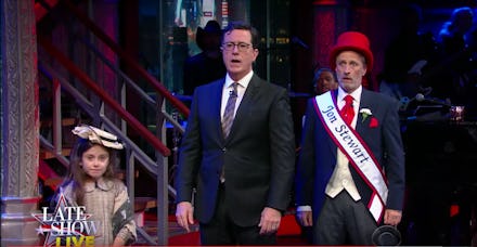 The bit from Colbert's live show starts with a "ragamuffin" little girl who is nervous to vote. She doesn't want to cast a ballot this year, and while Colbert tries to convince her about how important this election is, Stewart bursts in with a campy mayoral outfit supporting her right to sit out. But Stewart's lackadaisical approach to the election is, in part, because he didn't know who was on running.