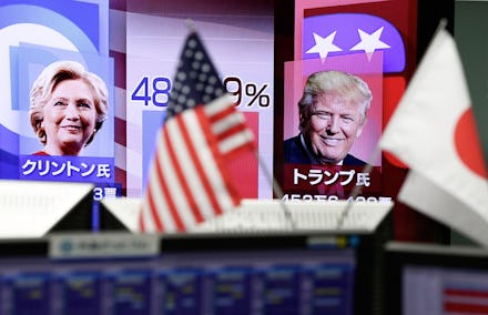 According to the Times, Trump stands at 265 electoral votes — just shy of the 270 required to win — with Clinton lagging far behind at 218. The real estate mogul and former reality TV star had a strong showing in swing states; he locked up Florida hours ago, won Pennsylvania and by the Times' estimate is projected to win Wisconsin and Michigan.