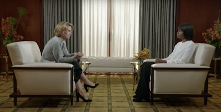 Scenes from the season six finale promo video show Lee in court, presumably on trial for the murder of Monet (Angela Bassett) and the three teens from the My Roanoke Nightmare fan site. Since Lee's not behind bars when she talks to Lana, it appears as if she may have avoided jail time for her crimes — after all, she was possessed by Scathach. But does Lana Winters believe her story? And is there still more to be told?
