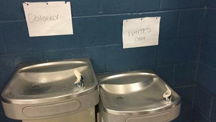 "Colored" and "whites only" signs placed above water fountains at Florida high school