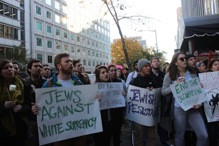 As protesters marched from D.C.'s Farragut Square to Trump's transition-team headquarters, the group made a stop outside the office of the Jewish Federations of North America, a mainstream Jewish organization that congratulated Trump on his victory and has not yet released a statement on Trump's appointment of Bannon.