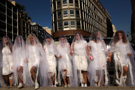Dozens of women in Lebanon gathered outside a Beirut government building on Tuesday clad in white dresses and bandages stained with fake blood in protest of a law that allows rapists to marry their victims.