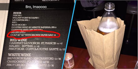A California bar is offering a 40-oz. Colt 45 complete with a brown paper bag for $15. Earlier this week, one Twitter user shared a photo of the audacious beverage option. The tweet caused such an outrage that it's since gone viral, earning more than 21,000 retweets.