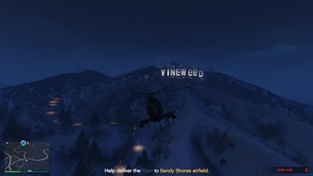 GTA 5 takes place in a pastiche of California called San Andreas, and its Hollywood stand-in is called Vinewood. As you might have guessed, it comes with its own hillside sign, and it looks some someone has recreated the Hollyweed prank with the Vinewood sign.
