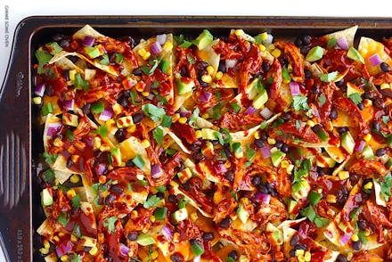 If you want to give your nachos more depth, try making these meaty nachos in a baking dish rather than a sheet pan. Forks and fingers will be ready to go as soon as the melty creation is out of the oven. Get the recipe here.