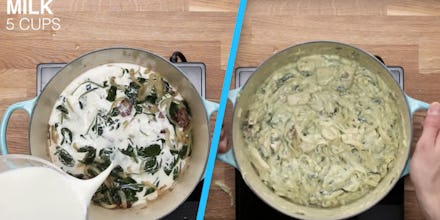 BuzzFeed's Tasty, which has seen its share of controversies, instructs readers to cook one pound of fettuccine in five cups of milk brought to a boil. Mix in a few other indulgent ingredients and — voila: One-Pot Creamy Chicken Bacon Pesto Pasta.