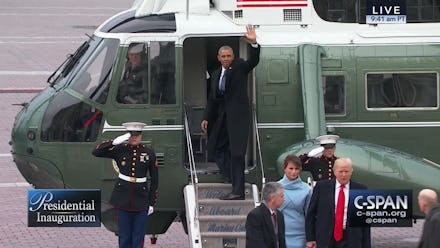 Barack Obama flew away from the U.S. Capitol Friday as an ordinary citizen moments after President Donald Trump was sworn in as the 45th president of the United States.