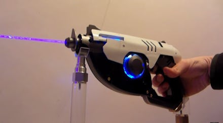 A YouTube video, uploaded by LaserGadgets, shows the gun has two settings: One that shoots a sustained beam, and another that rapidly pulses in small bursts to more accurately reflect how Tracer's guns actually fire.