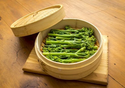 The most efficient way to cook vegetables and proteins without oil? Steam! Set this bamboo steamer over a pot of boiling water, line it with cabbage or parchment paper, and steam all of your favorite ingredients. Delicious.
