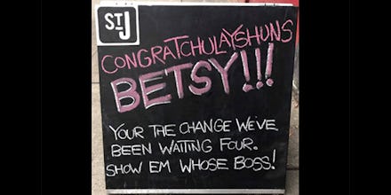 In Seattle, one bar and eatery decided to decorate its chalkboard with a wisecrack based on current politics. On Tuesday, Saint John's Bar and Eatery placed a board that read "Congratchulayshuns Betsy!!! Your the change we've been waiting four. Show em whose boss!"