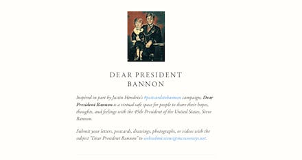 The project is an ongoing anthology of letters addressed to Steven Bannon, Trump's chief strategist, which criticizes and mocks the administration with satire. Dear President Bannon started after Justin Hendrix, executive director of NYC Media Lab, started the #PostcardToBannon campaign to get people to send mail to the White House addressed to "President Steve Bannon" rather than Trump. That initiative started after reports announced Trump appointed Bannon to the National Security Council, which gave him more power in the White House.