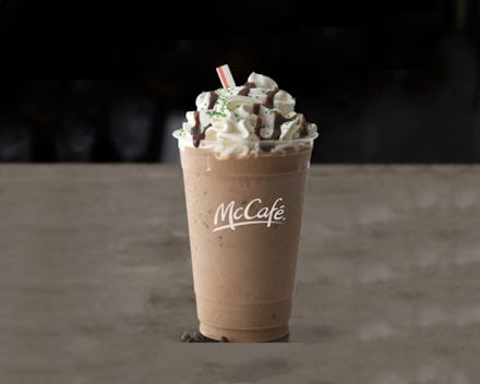 The McDonald's website describes the Shamrock Chocolate Chip Frappe as "an irresistible blend of coffee and chocolate chips, topped with green sprinkles, whipped topping and a tantalizing drizzle of Chocolaty Syrup."