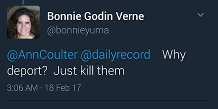 "Why deport? Just kill them," Verne wrote in response to an Ann Coulter tweet. She later followed up with, "Or we can just put a bullet in their head immediately."