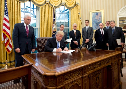 Save for secretary of transportation pick, the yet-to-be-confirmed Elaine Chao, and Secretary of Education Betsy DeVos, Trump's Cabinet is overwhelmingly male. That fact really stings when, you know, a group of men all gather round to sign legislation limiting women's reproductive rights, for example.