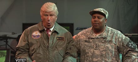 In SNL's vision of 2018, hostile aliens are obliterating the American people. They have already zapped California off the map. A camo-clad Kenan Thompson is rallying troops for a last stand against the alien invaders, and calls on Alec Baldwin-as-President Donald Trump to give a final, motivating word. That's not what he does.
