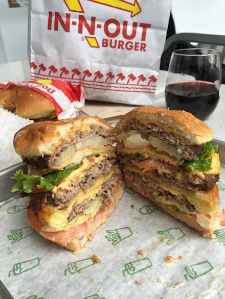 The city of Los Angeles houses two Shake Shack locations (the first one opened in late 2015, so the restaurant is still relatively novel). Arangio and his girlfriend started at In-N-Out, picking up a Double Double, and then made their way over to Shake Shack to get their supplies. Arangio said he received some glares from customers and staff while waiting in line for the second burger, In-N-Out contraband in tow.