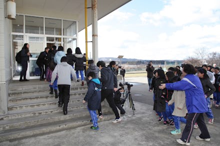 Hunched-over schoolchildren made their way to a gymnasium, and other residents donned protective gear as they made their way to a designated evacuation center, emergency kits in tow.