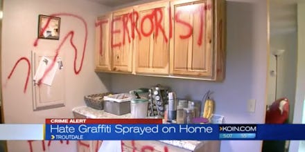 After taking a three-day vacation, Afshar — an Iranian refugee — returned to his home in Troutdale, Oregon, to find it vandalized with racist epithets and bullets in the shape of a cross. "Terrorist," "Muslim" and "Get out of America" were spray painted in red all over the walls in his home. A threatening letter also accompanied the graffiti.