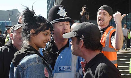The now-viral photo shows a young woman standing up against a protestor from the far-right English Defence League on Saturday during a rally in Birmingham, England.