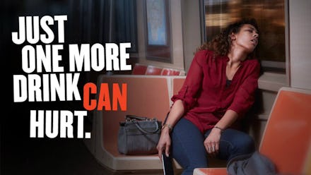 This poster, featuring a woman, is quite different. The woman is shown slumped over and snoring in a subway car, apparently exposed to and defenseless against potential threats. Next to her is the campaign tagline: "Just one more drink can hurt."