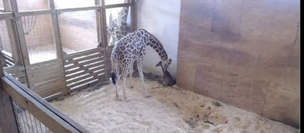 On Saturday, Facebook and YouTube livestream superstar April the giraffe finally gave birth to her calf. The calf's father, Oliver, was not there for the birth.