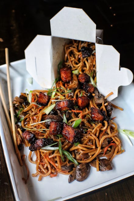 To create the leftover-style dish (which is made fresh for the restaurant's purposes), Birnbaum and his chef Keith Geter tried as much takeout lo mein as they could humanly handle, "trying to emulate it, but with just a touch [of] finesse," Birnbaum said. They upgraded the meat from traditional char siu pork to pork belly to "give it a bit of decadence and make it stand apart from what you find at a take out shop."