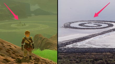 The cool thing about the visual similarities between the two swirly structures — whether intentional on Nintendo's part or not — is that Breath of the Wild and Spiral Jetty have a lot of thematic crossovers too. One of the main themes in Smithson's work is entropy, the idea that things naturally degrade over time as they interact with the world around them. His earthworks exist within the natural processes of nature, meaning that Spiral Jetty might look completely different now than it will in 10 years.