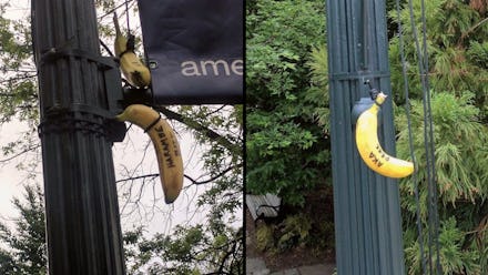 The bananas were found in three areas: a bus stop, a dining hall and an undergraduate co-ed residence hall. Here are photos of the bananas found on campus: