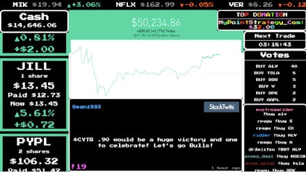 After six months of tinkering, he has now released his invention: Stock Stream, which Roberts is billing as "the world's first multiplayer stock market game that uses real money." As of last week, anyone with an account on the game-streaming site Twitch could log-in and help allocate $50,000 of Roberts' money by typing stock symbols into the Stock Stream's comment section.