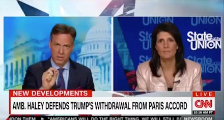 "President Trump believes the climate is changing," Haley said to Tapper. "And he believes that pollutants are part of the equation."