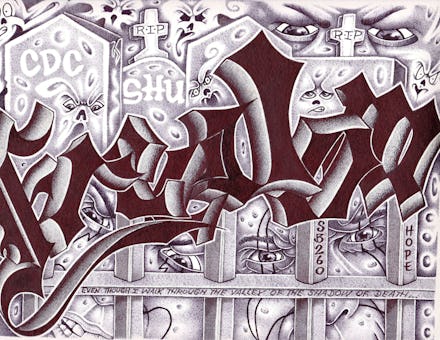 Often, though, getting artwork out of a facility to send to family and supporters is a challenge. There are over 5,000 jails and prisons across the United States and, for the most part, laws concerning the making and selling of prison art differ by state and facility. The Federal Bureau of Prisons has forbidden inmates from running a business from prison, and more than 40 states and the federal government have Son of Sam laws in place, which stipulate that no prisoner can profit from their crime — meaning artwork set to sell must have no direct connection to the crime the artist was convicted of.